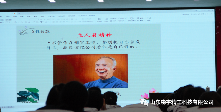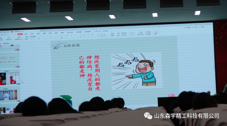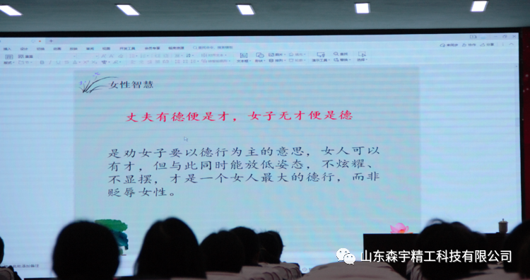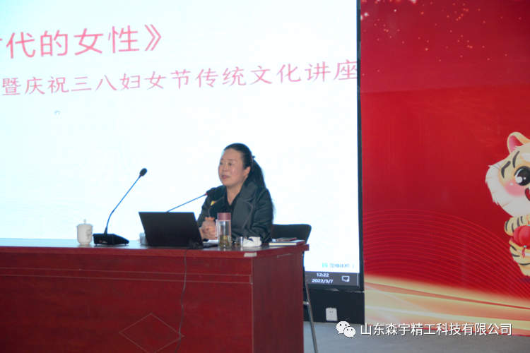 2022年3月7日,山東森宇精工科技有限公司在新辦公樓多動能廳舉辦了《智能時代的女性》傳統(tǒng)文化講座活動。慶?!叭恕眹H婦女節(jié),傳承中華文化,弘揚(yáng)傳統(tǒng)美德,營造文明祥和的社會氛圍。